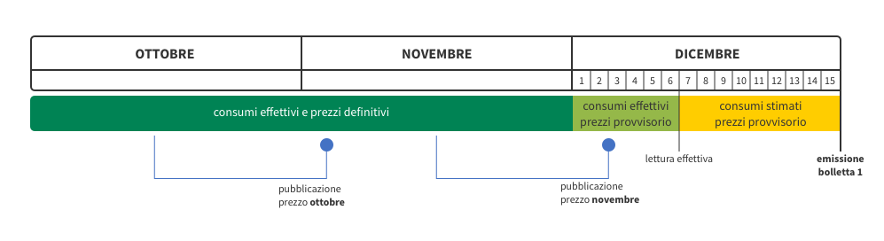 In questo esempio, dal momento che la bolletta è emessa il 15 dicembre, il prezzo della Cmem di ottobre e novembre è definitivo, mentre la Cmem di dicembre è provvisoriamente valorizzata in base al prezzo valido per il mese di novembre: il prezzo definitivo di dicembre sarà noto solo entro il secondo giorno lavorativo di gennaio.
